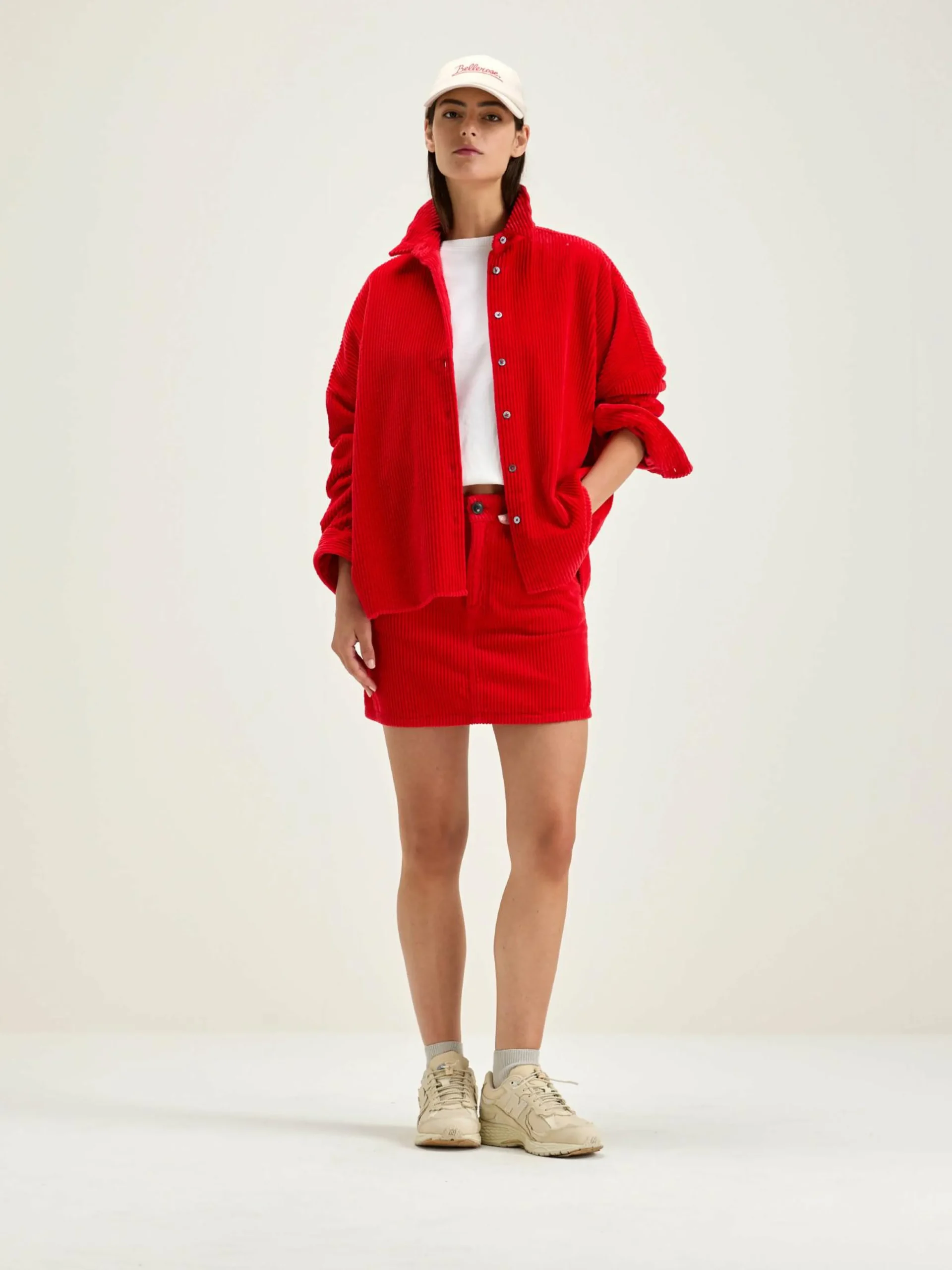 Donkerrode, trapeziumvormige minirok in five-pocketstijl, corduroy met brede rib.