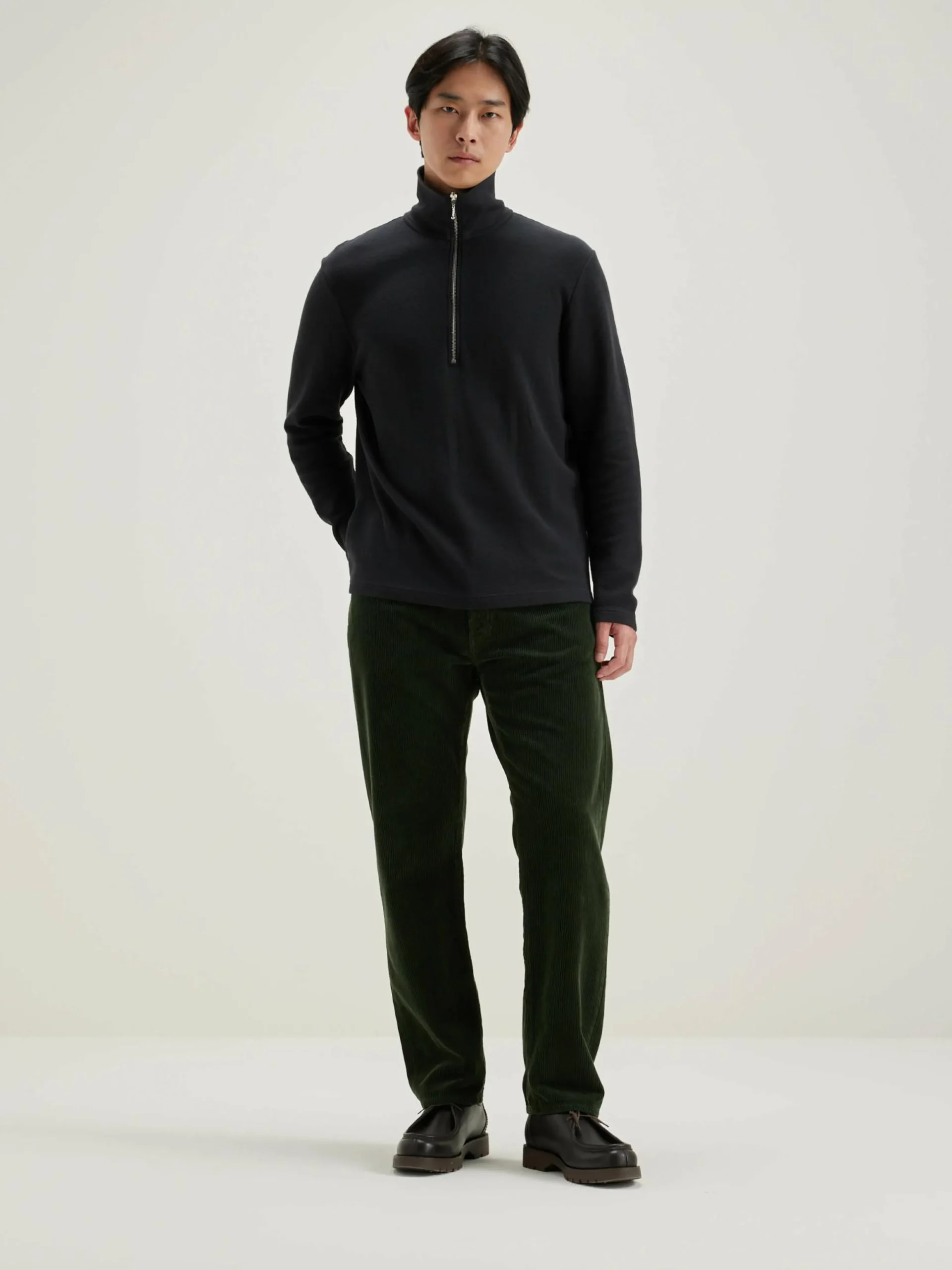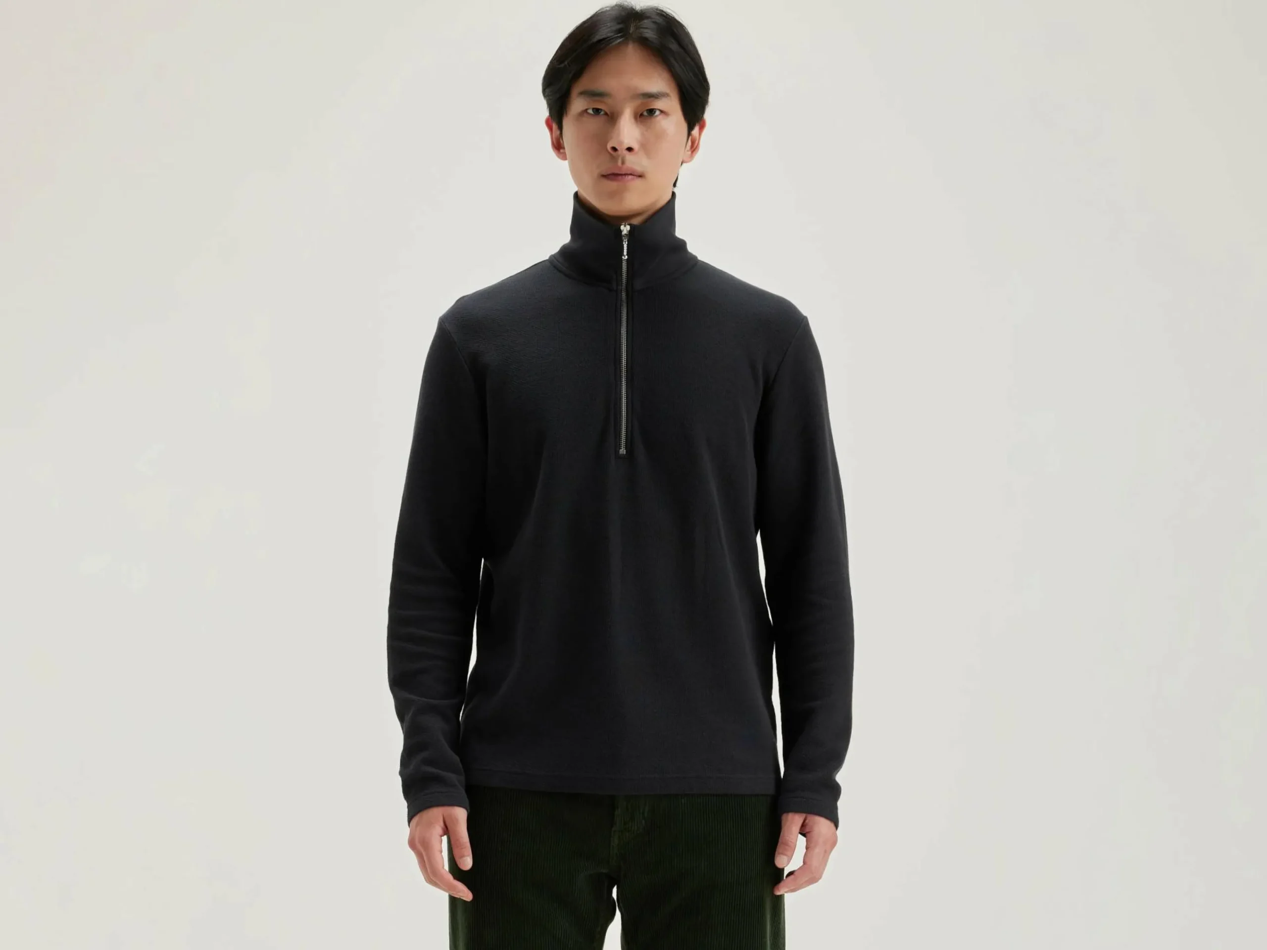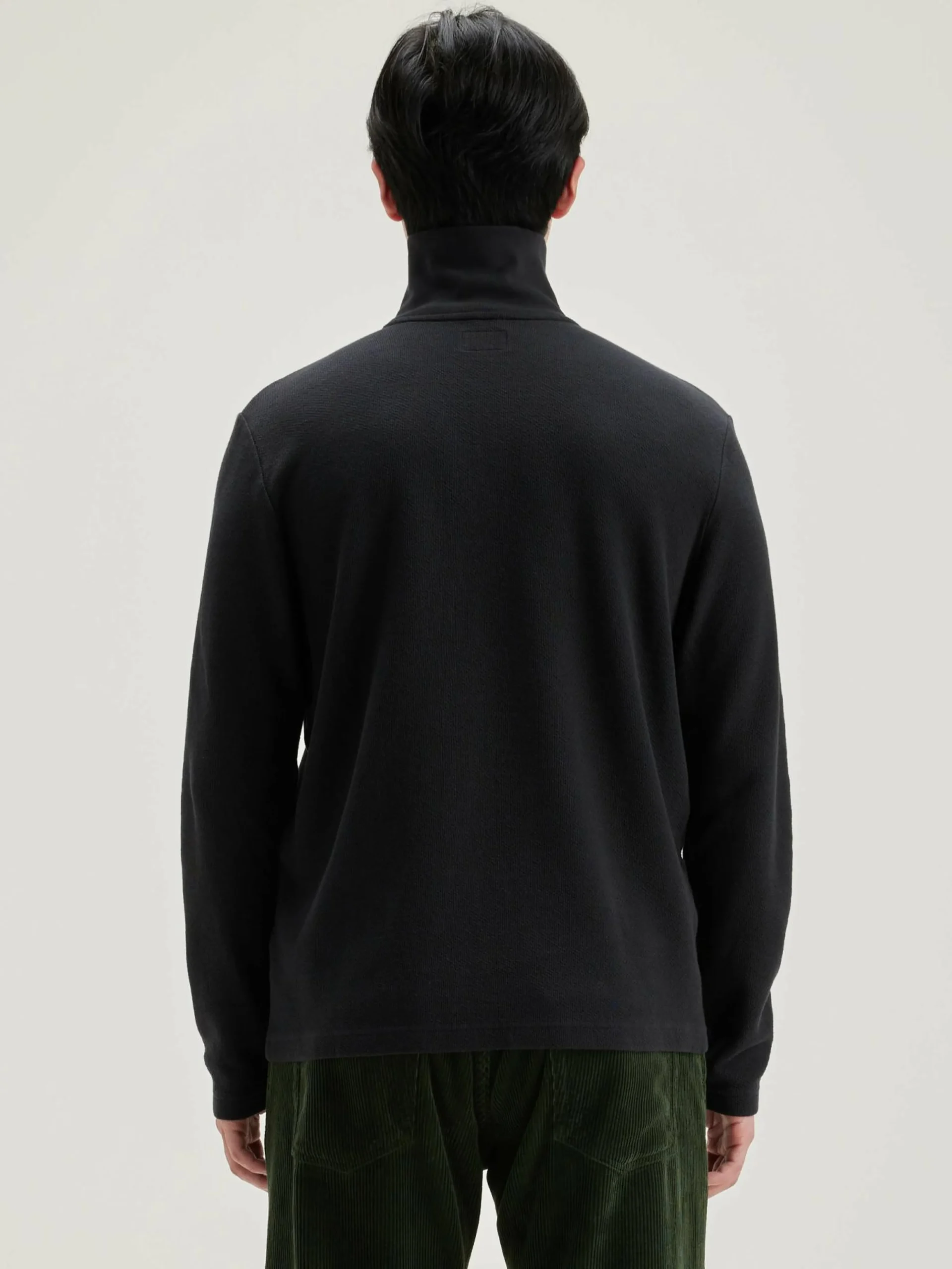 - Opstaande, geribde kraag met halve ritssluiting