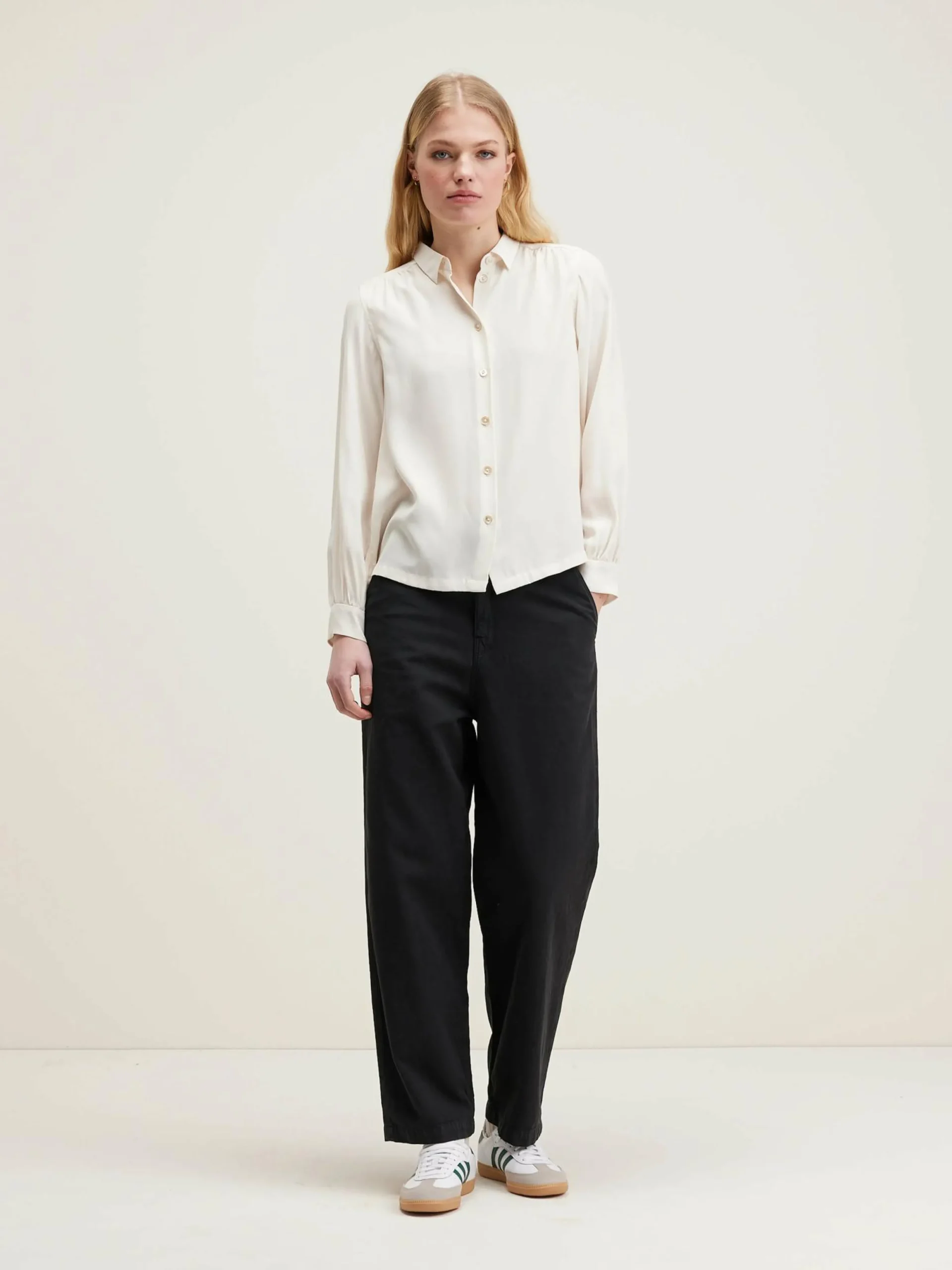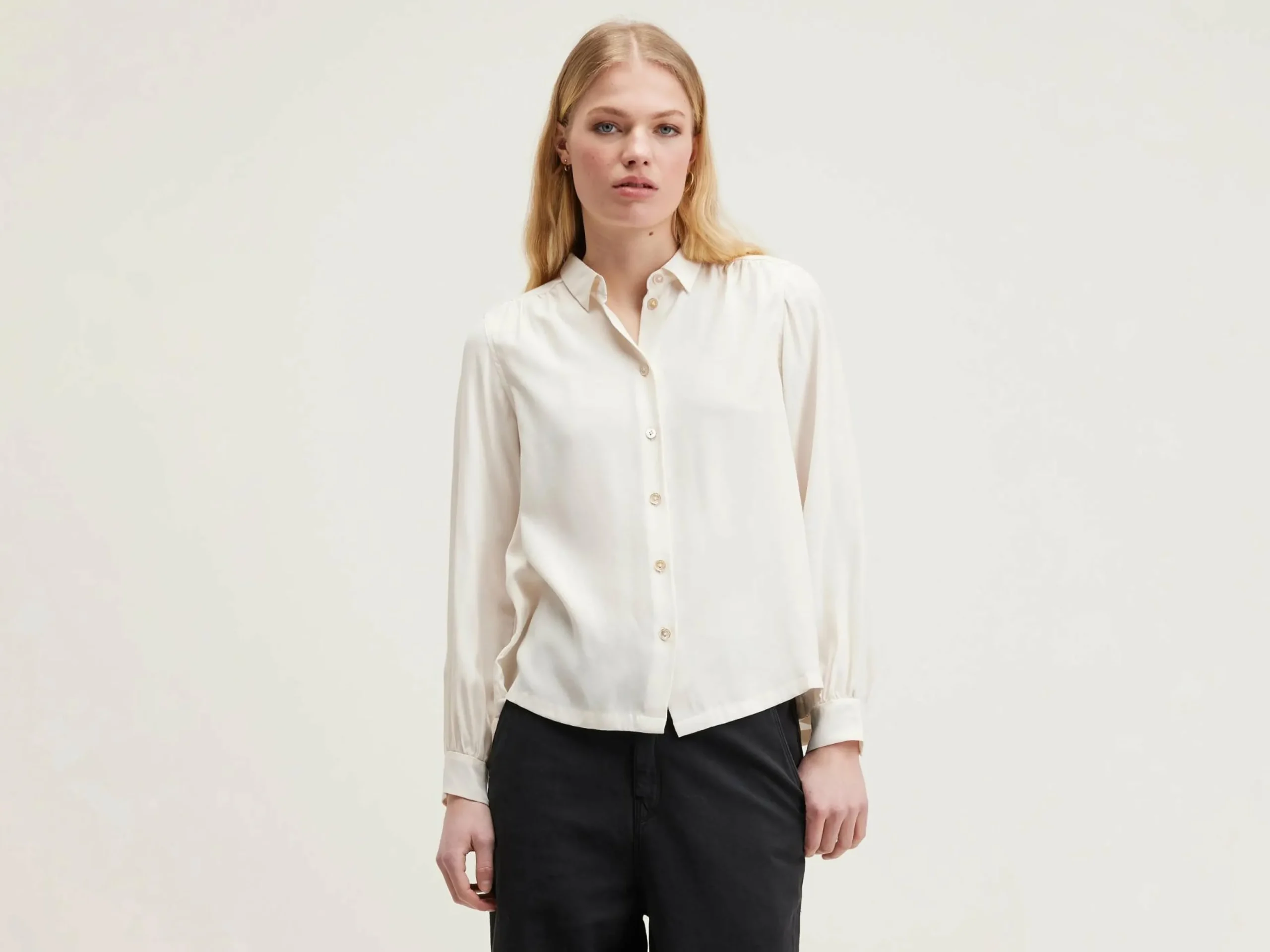 Klassieke zijden blouse met knoopsluiting en gerimpelde jukken voor en achter, parelmoeren knopen.