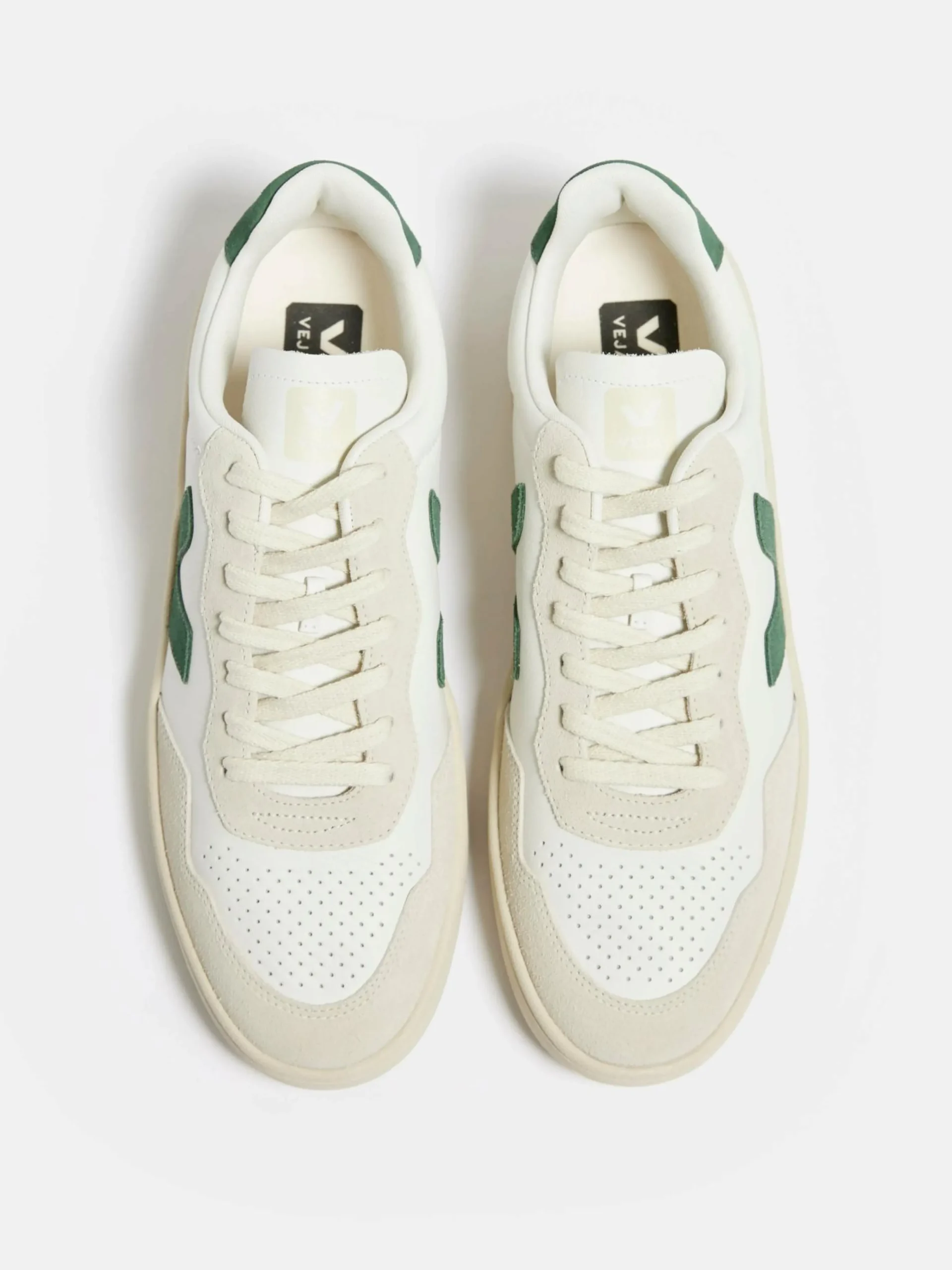 De Veja V-90 sneakers hebben een bovenwerk van Organic Traiced leder met iconische rubberen zolen uit Amazonië en milieuvriendelijke ontwerpelementen.