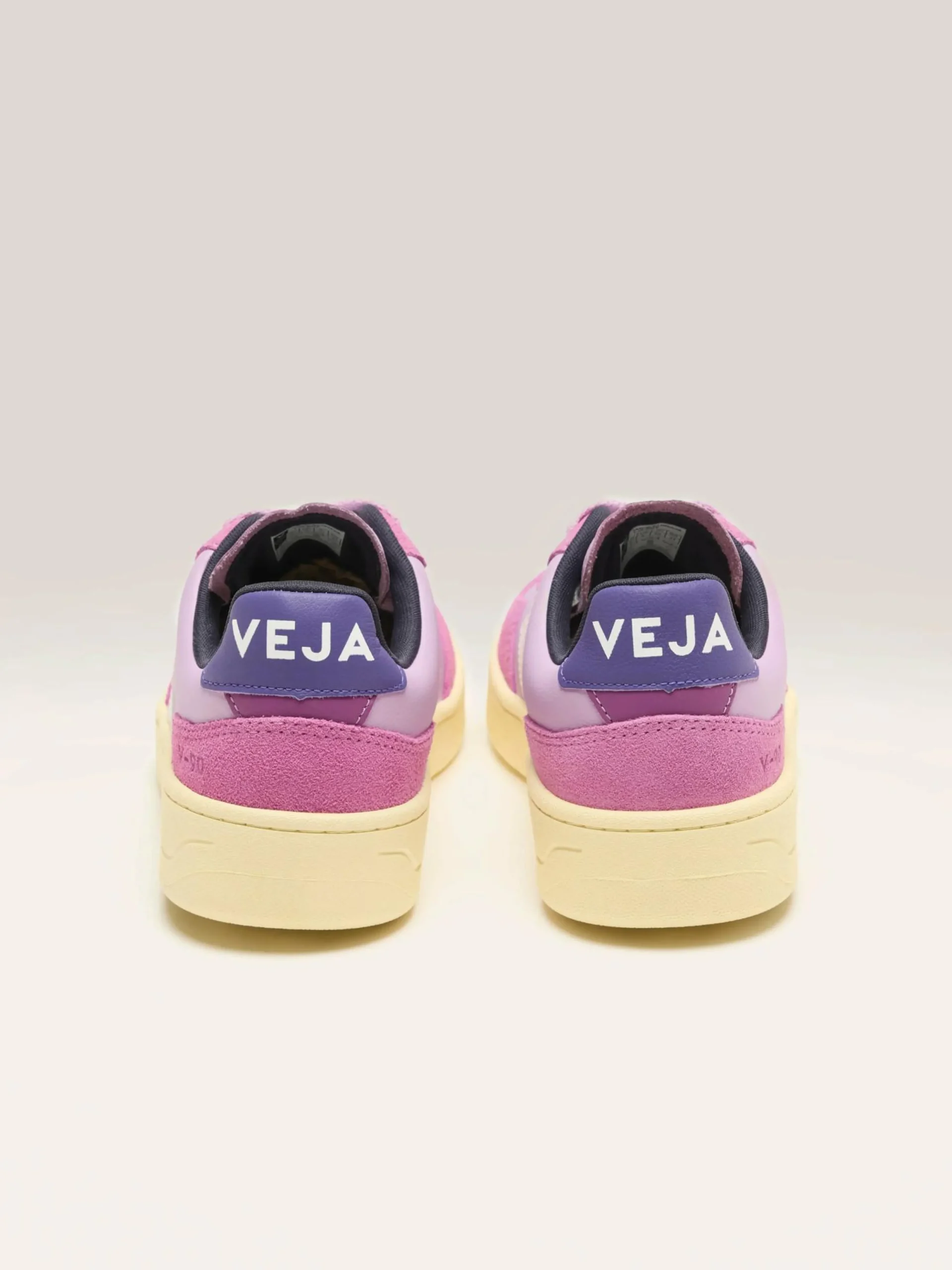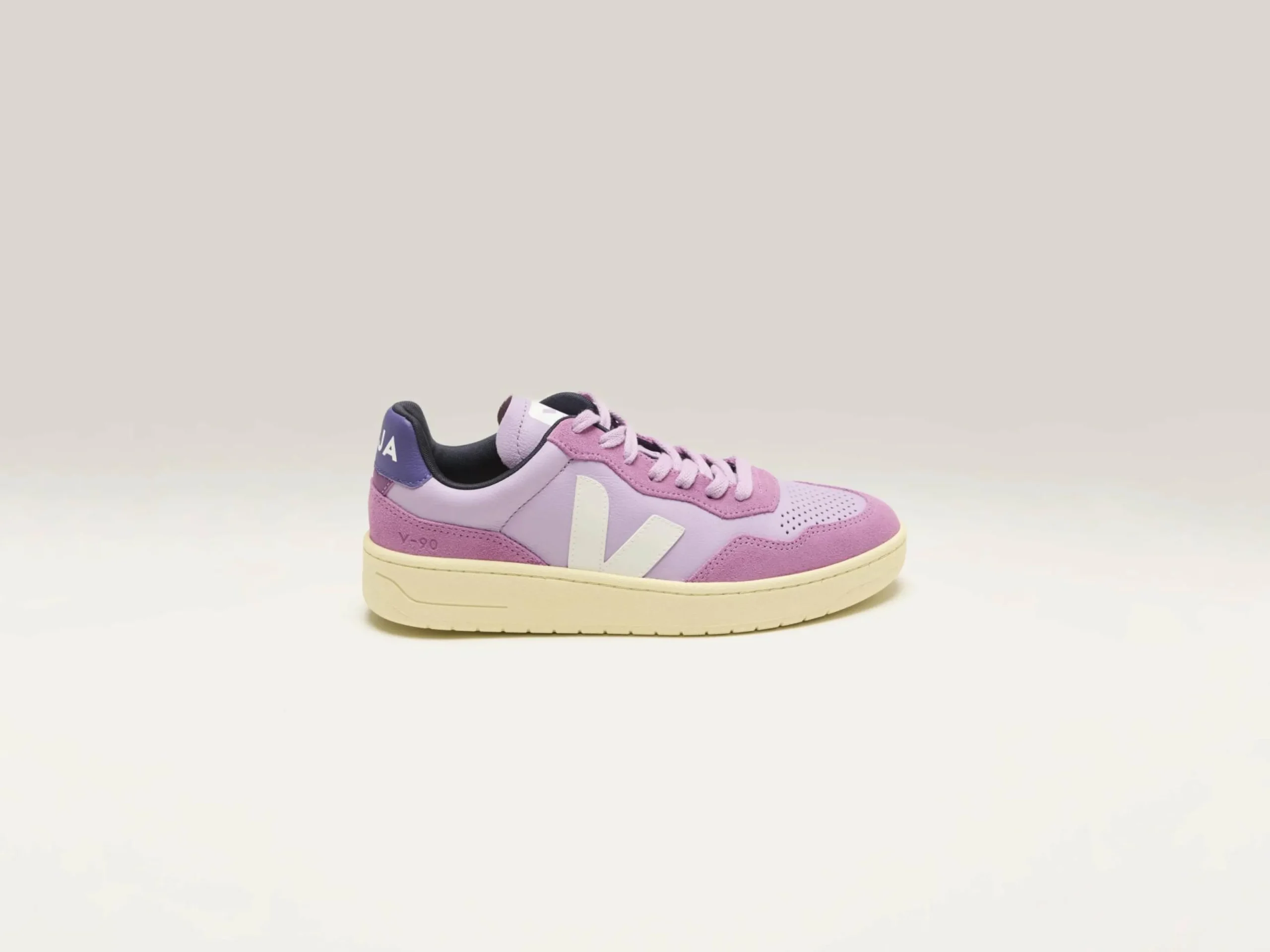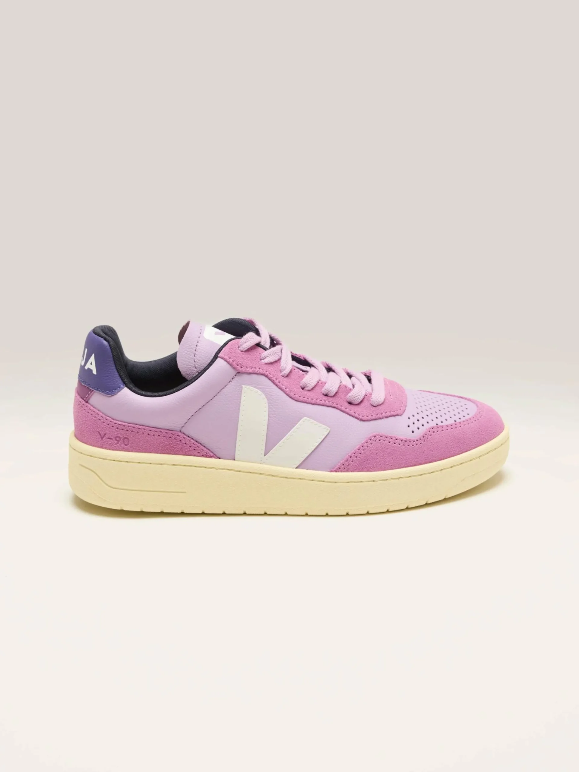 The Veja V-90 sneakers feature Organic Traced leather uppers with iconic Amazonian rubber outsoles and eco-friendly design elements.