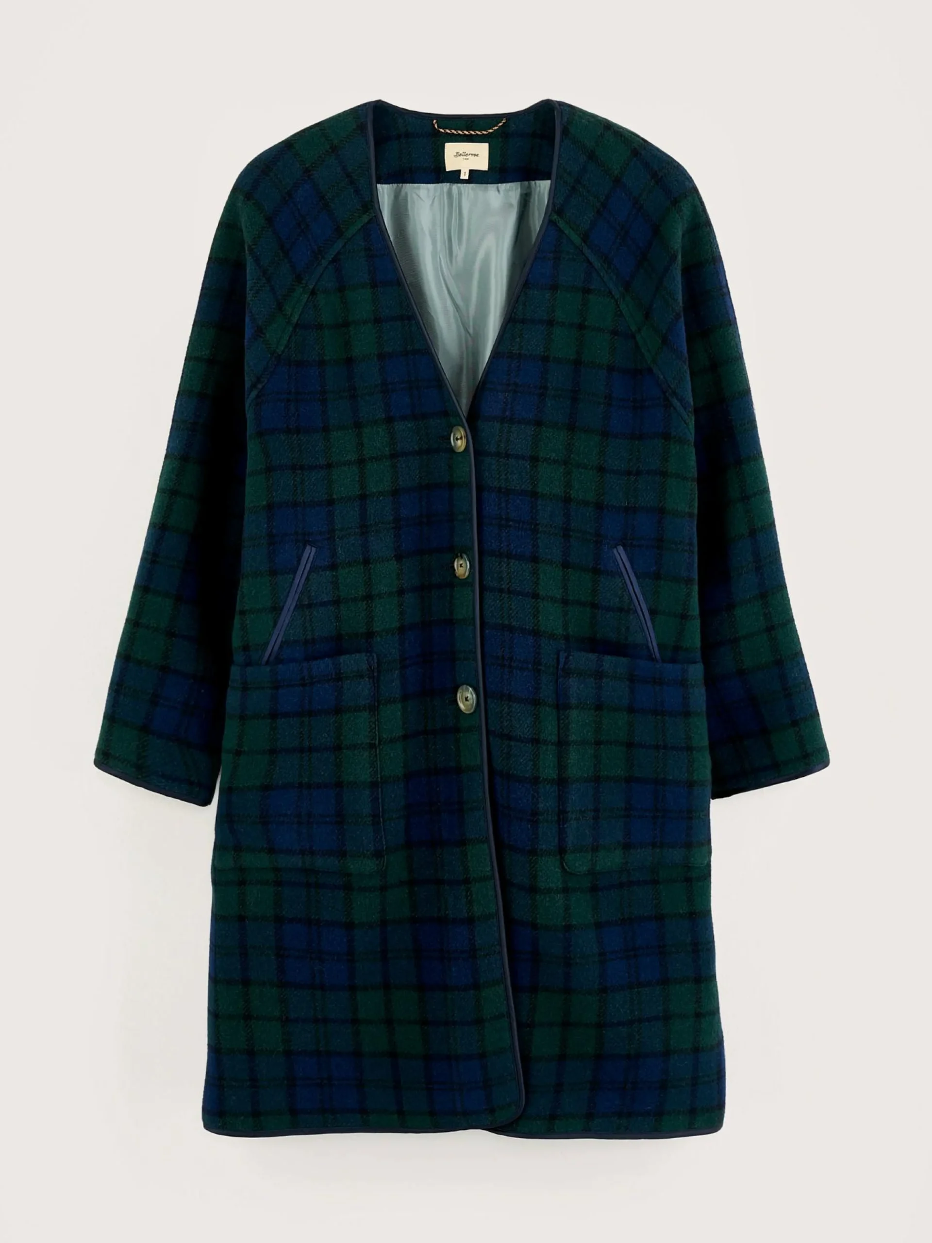Lange mantel zonder kraag, met v-hals, in black watch ruiten.