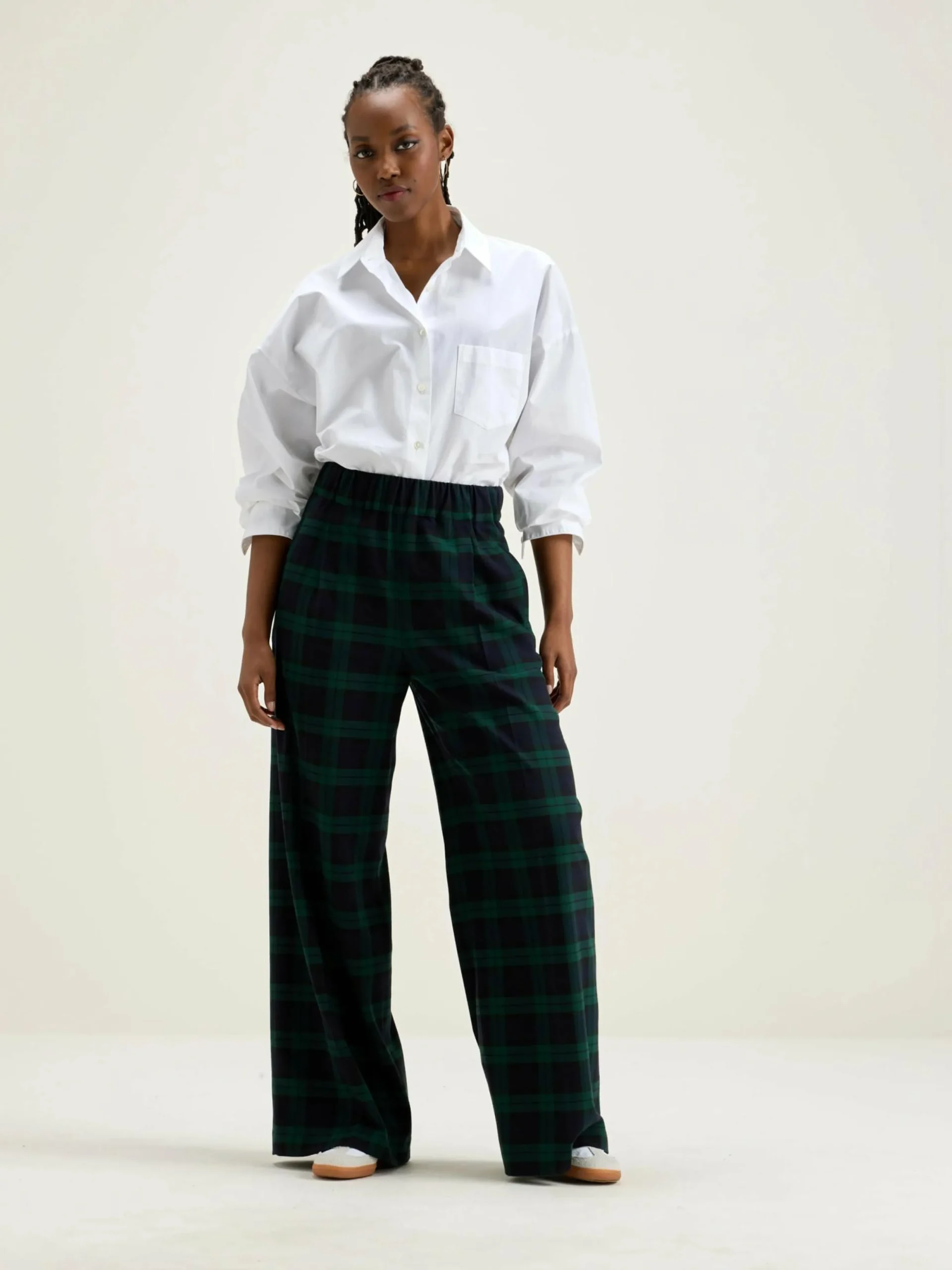 Broek met wijde pijpen, een elastische tailleband en paspelzakken, met black watch ruiten.