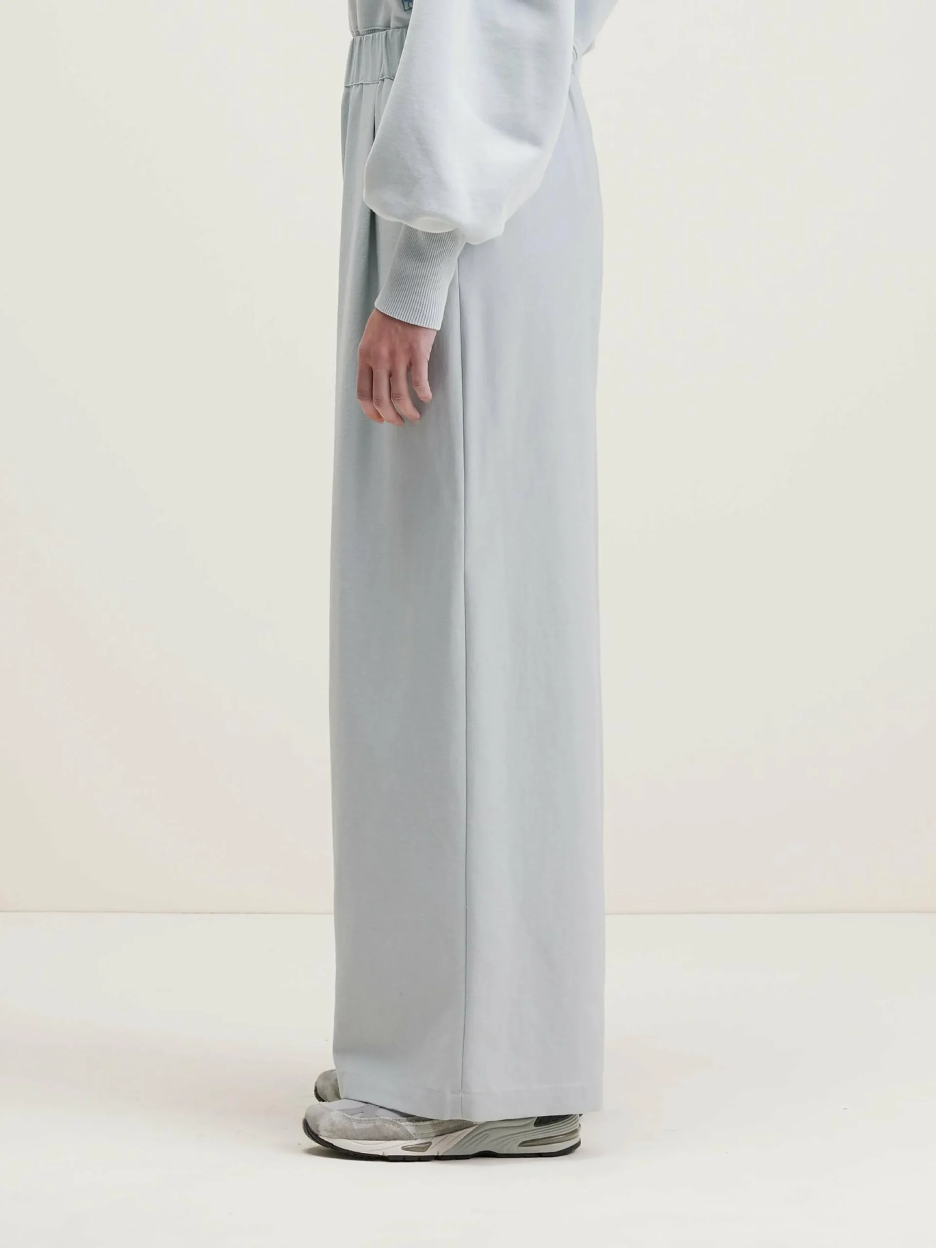 Relaxede, lichtblauwe high-waist broek met wijde pijpen.