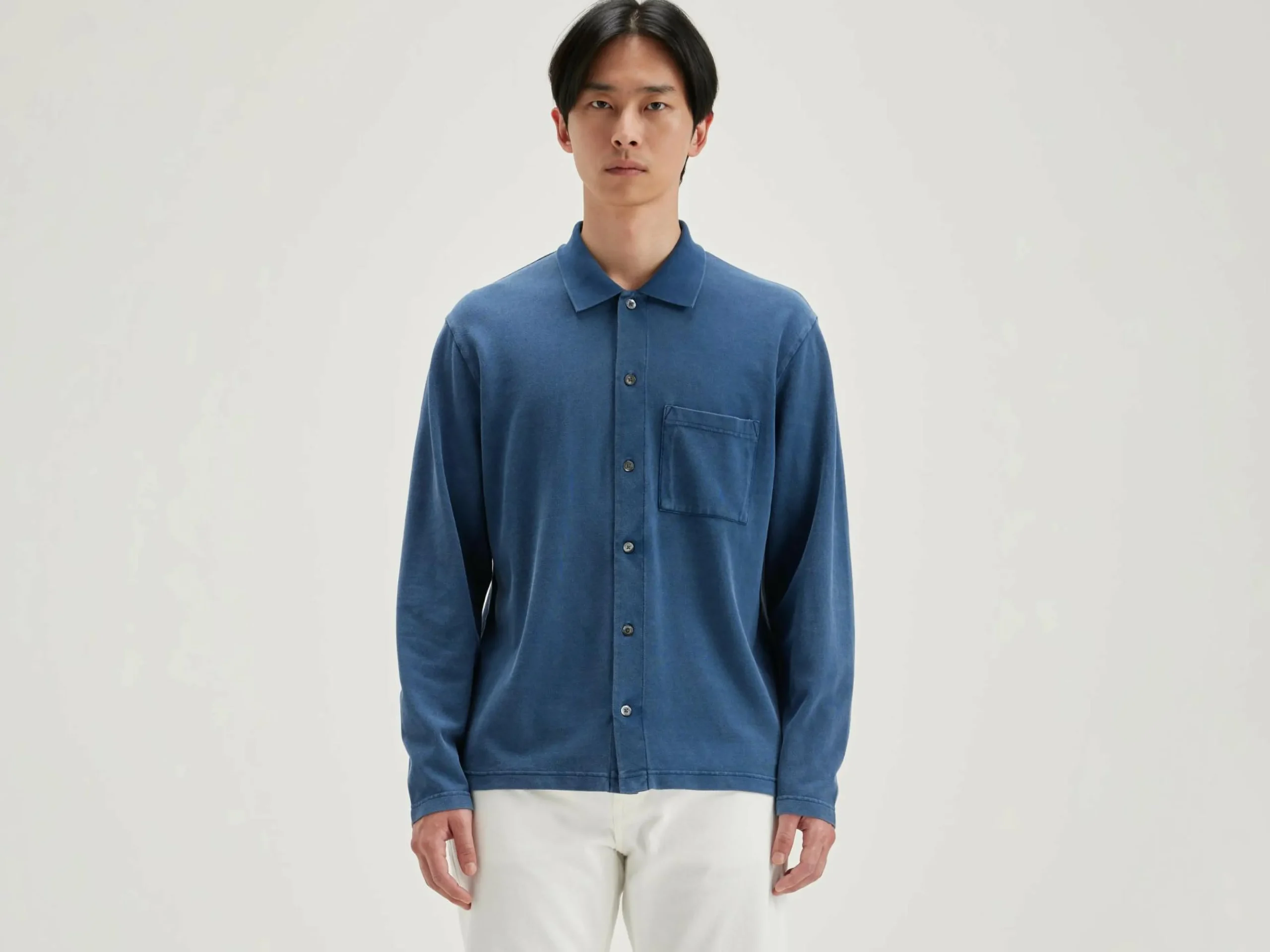 Comfortabele polo met knoopsluiting vooraan, van inktblauw katoen.