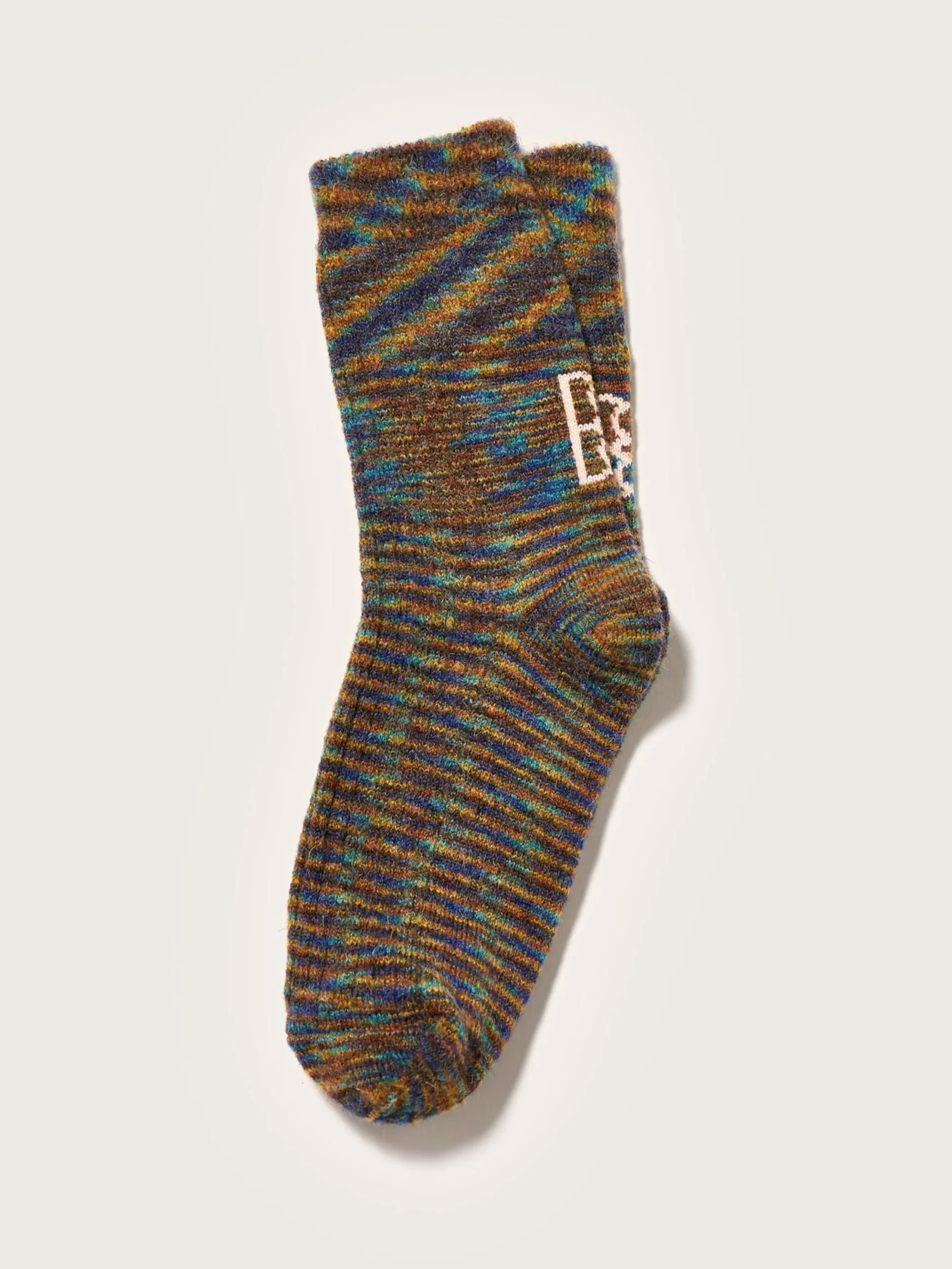 Klassieke sokken van meerkleurig garen, met contrasterend roze Bellerose-logo op de hielen.