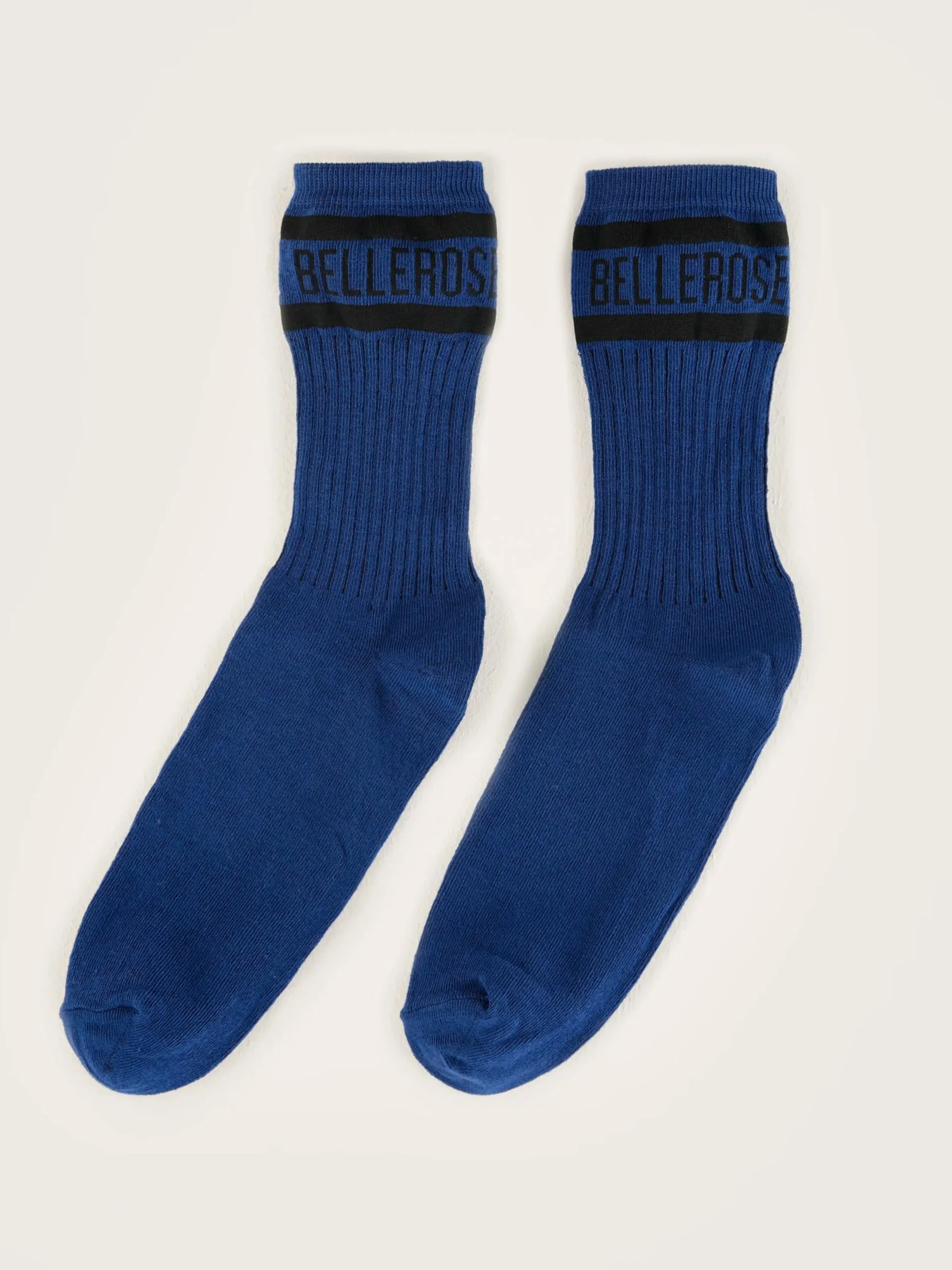 Klassieke sokken in blauw met het Bellerose-logo in zwart op de enkel.