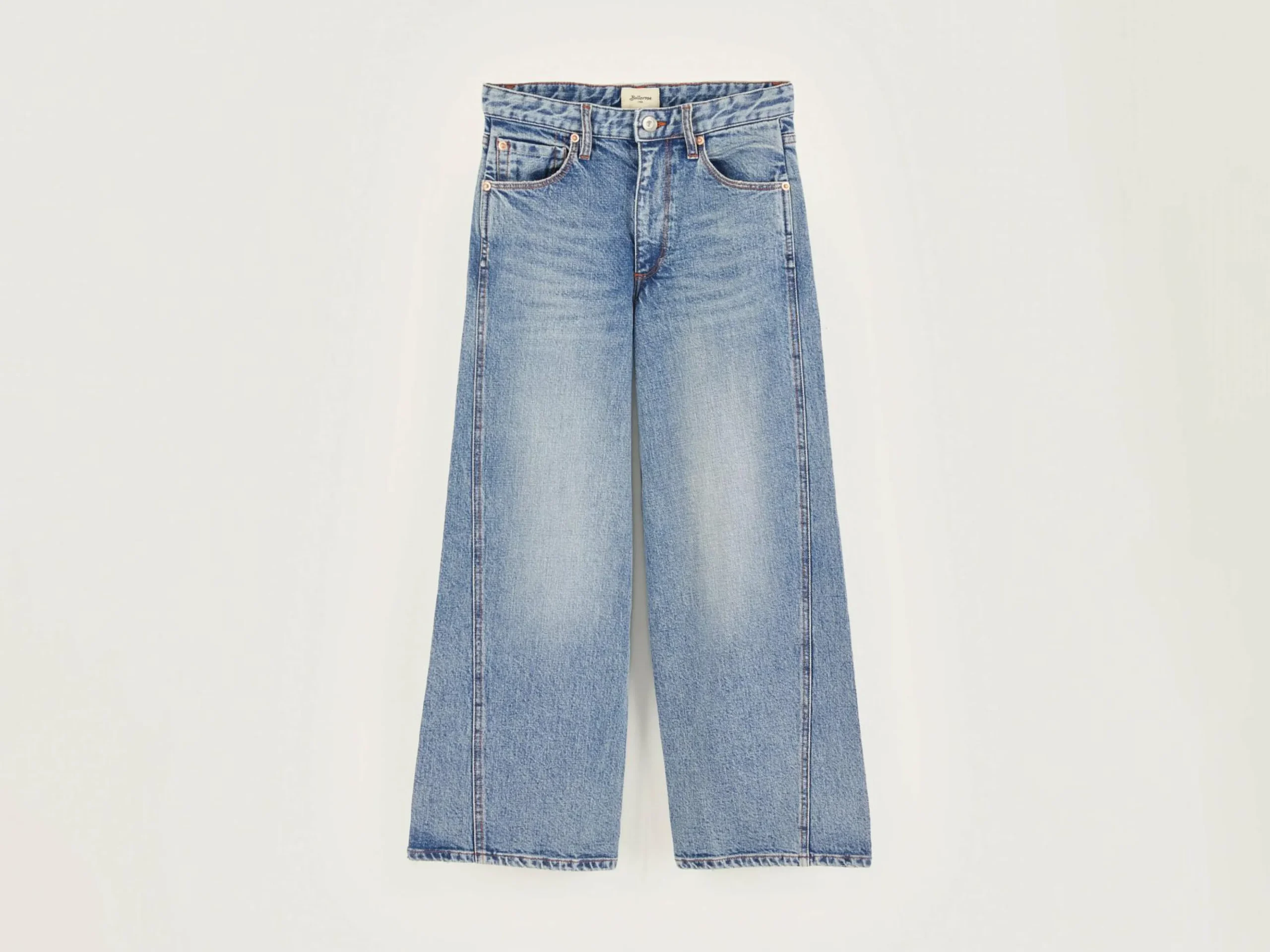 Lage taille jeans in lichte blauwe stone wash met flared pijpen.