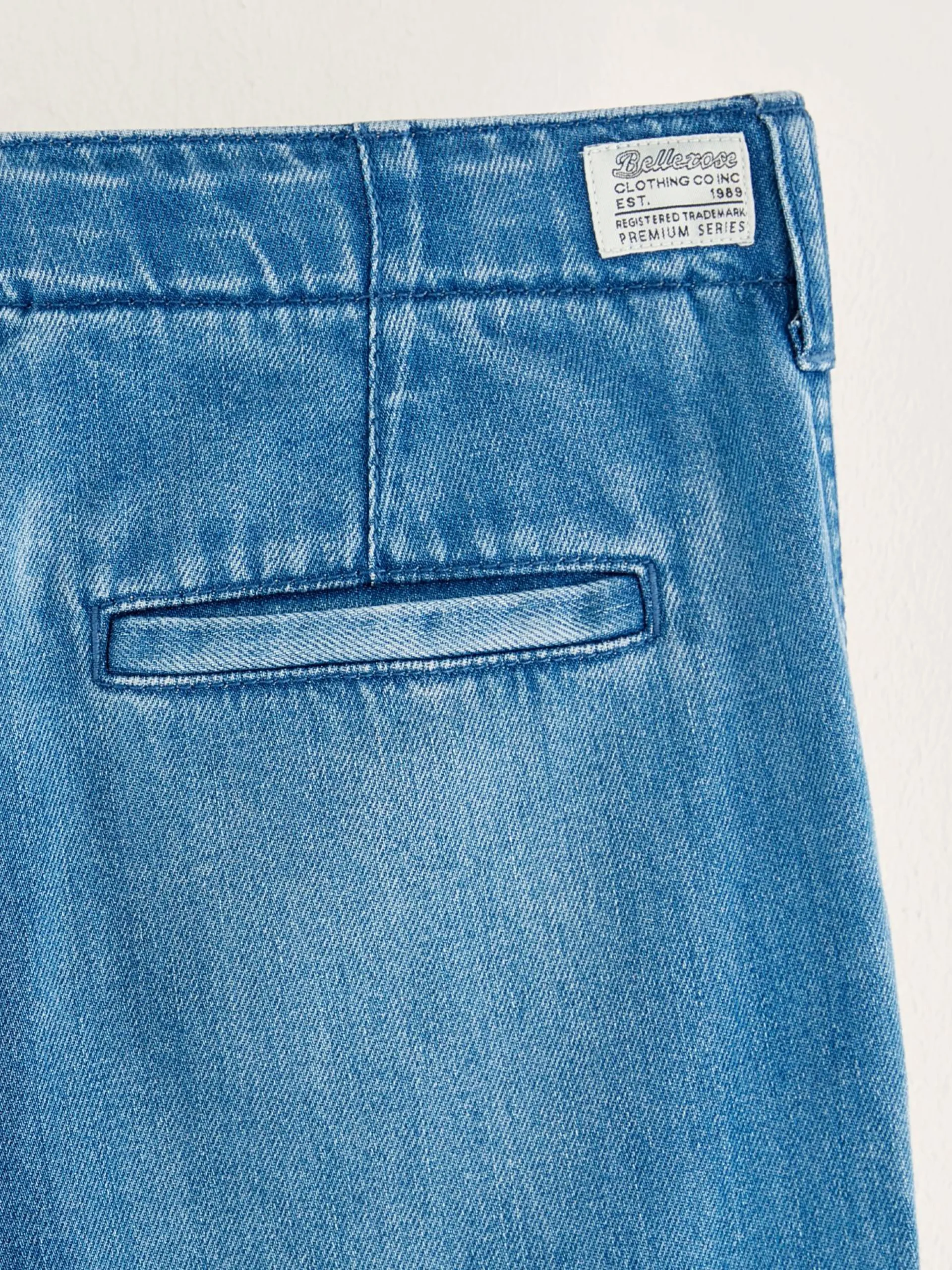 Blauwe broek in cargostijl, met wijde pijpen.