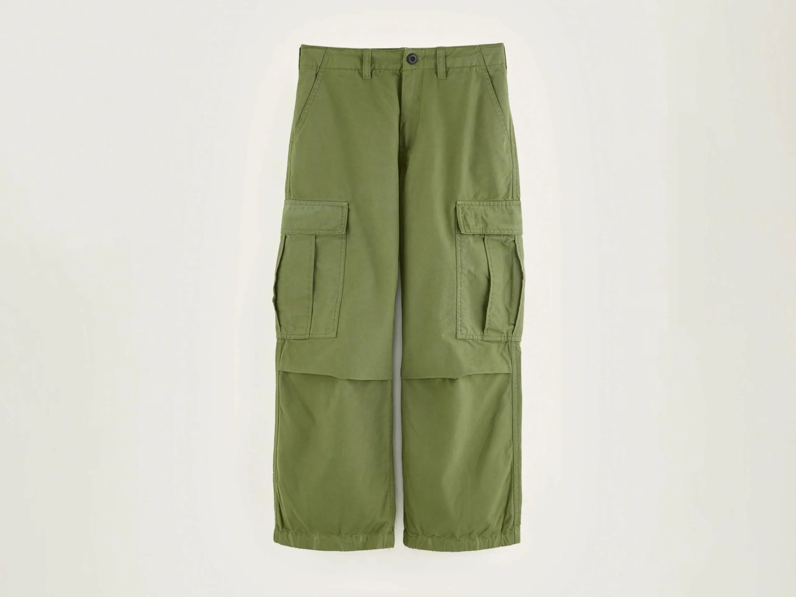 Kaki broek in cargostijl, met wijde pijpen.