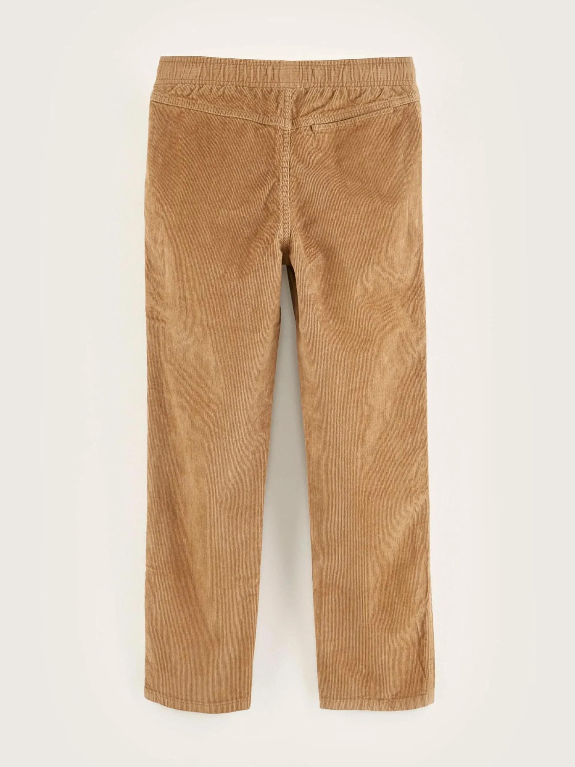 Comfortabele, bruine corduroy broek met taps toelopende pijpen en elastische taille met rijgkoord.