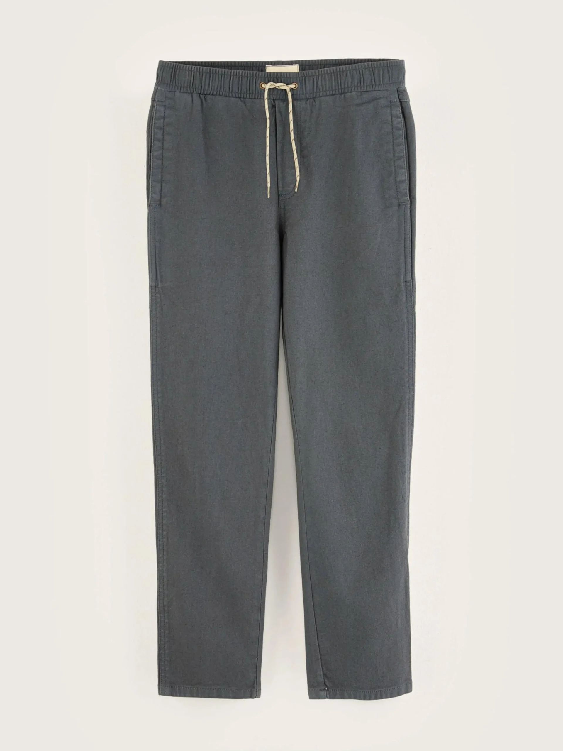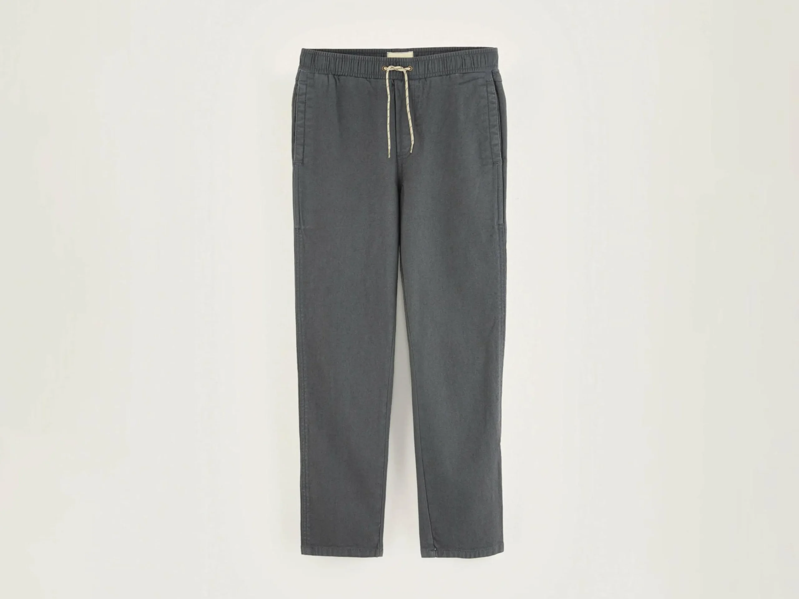 Comfortabele, donkergrijze broek van canvas katoen, met taps toelopende pijpen en elastische taille met rijgkoord.